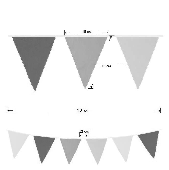 Гирлянда состоит из 42 флажков, из них длина вымпела 9 м, а длина лямок с обеих сторон 45-50 см
