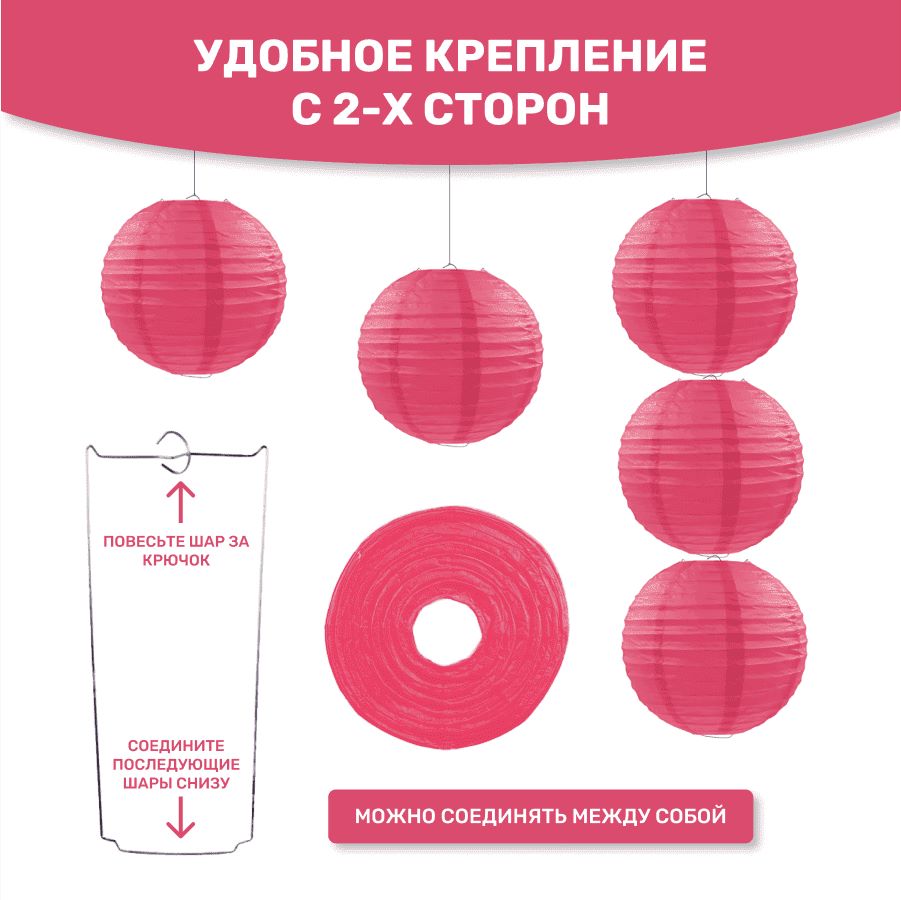 В комплект входит 8 бумажных фонариков и лента атласная.