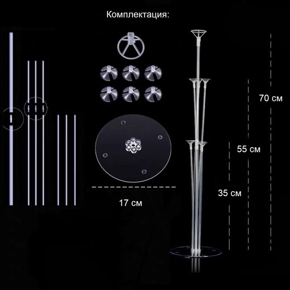 Комплектация: Основа-подставка, центральная труба (70 см), держатель на 7 шаров.