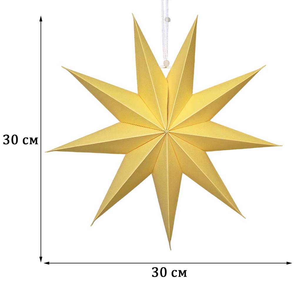 Объёмная декоративная звезда из картона диаметром 30 см с 9 лучами. Оснащена встроенным шнурком для подвешивания. Поставляется в компактном сложенном виде и быстро собирается: специальный шнурок при затягивании придаёт изделию объём и фиксирует форму. После сборки звезда остаётся устойчивой без дополнительных креплений и может использоваться многократно.
